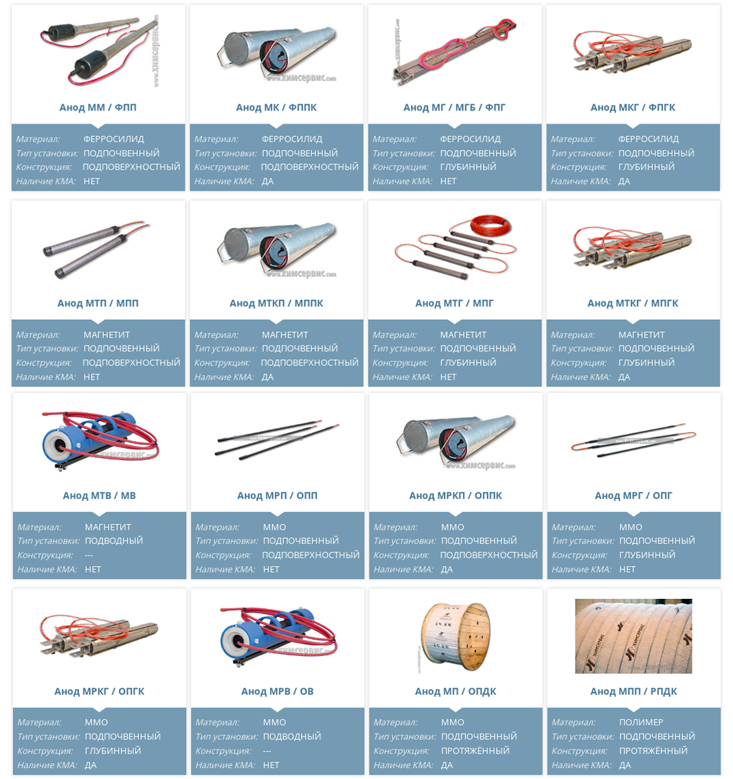 Сегодня выпускаются более 15 различных видов анодных заземлителей, которые отличаются конструкцией, материалом рабочих электродов и областью применения.