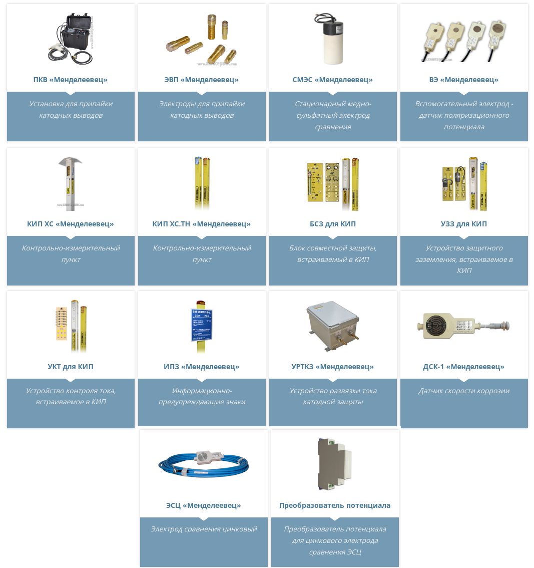 Основная продукция компании: анодные заземлители "Менделеевец" и другое оборудование ЭХЗ (КИП, электроды сравнения, датчики скорости коррозии), приборы для диагностики систем ЭХЗ, а также установки лазерной очистки металлических поверхностей.