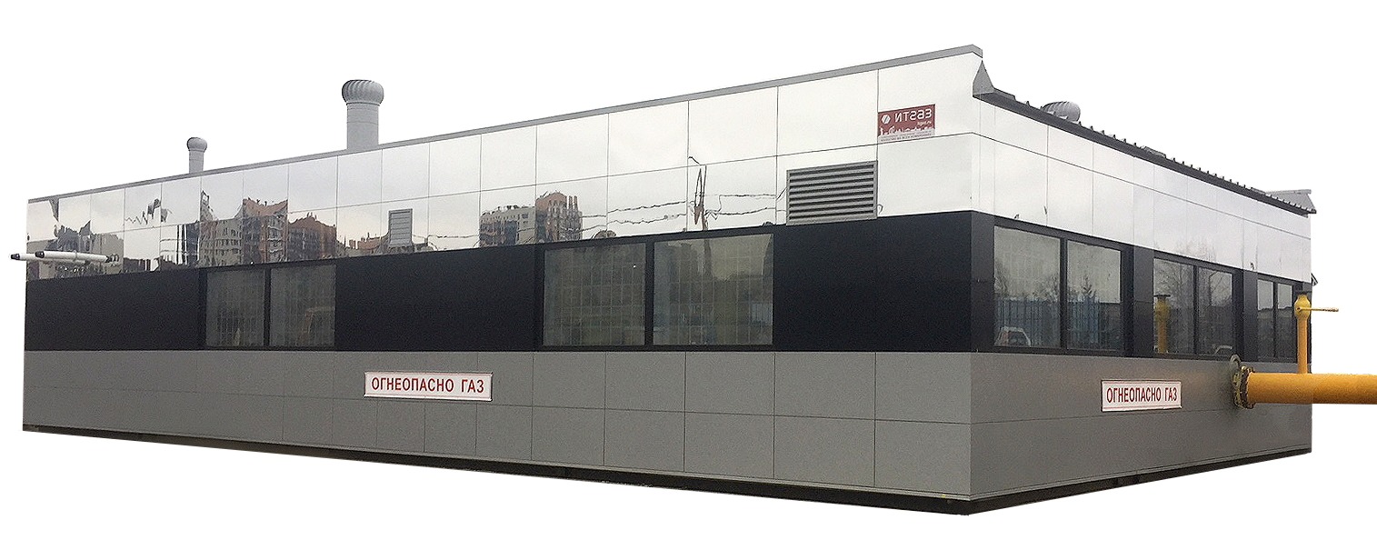 Представляет конструкцию, состоящую из одного или нескольких транспортабельных контейнеров, изготавливаемых в заводских условиях с внутренней, наружной отделкой. Предназначен для снижения входного давления природного газа и его автоматического поддержания в установленных пределах, фильтрации газа, кратковременного сброса избыточного давления газа, а также для автоматического отключения подачи газа при аварийном повышении или понижении выходного давления сверх допустимых заданных значений.